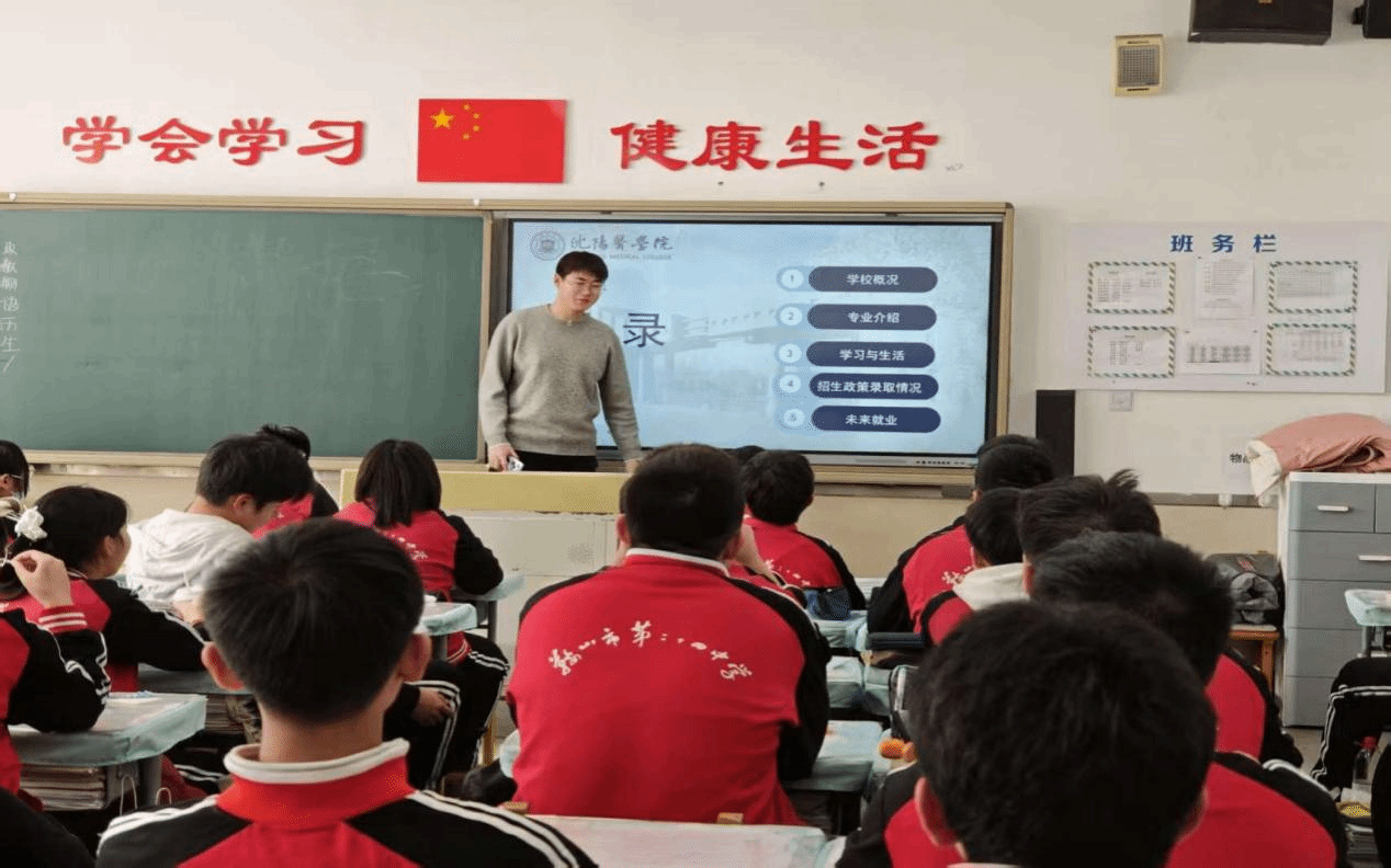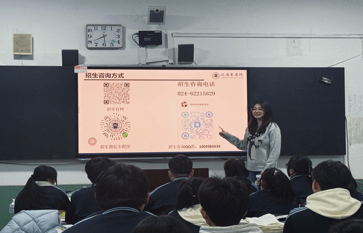 为让宣讲更具针对性与实用性,团队提前做好充分准备:收集校园风景、学习实训、文体活动等实拍照片整理成电子相册,制作图文并茂的宣讲材料;同时准备报考指南、专业介绍、历年录取数据等实用资料,为学弟学妹呈现真实、全面的沈医风貌。在母校老师的协助下,于高三35班开展专场分享会。重点介绍沈医优美的校园环境与完善的教学实训设施,分享在校学习体验及科研、双创赛事成果;详细讲解医学专业分类、报考分数参考,以及大学自主学习模式、社会实践机会等内容,并现场留下学校官方招生联系方式,方便学弟学妹后续咨询答疑。