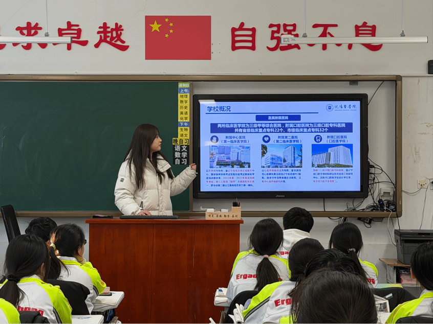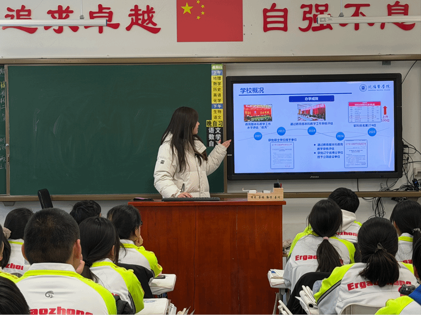 宣讲前,团队准备了学校PPT和宣讲稿提炼沈医核心亮点,针对班级的选科情况,整理报考指南并配套展示近三年录取线。宣讲现场,团队以时间轴讲校史,突出办学与临床资源优势,讲解一流专业特色,展示校园生活,解读选科报考要求、演示招生小程序,答疑解惑中高效传递招生信息。